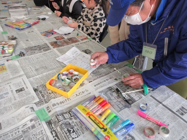 キャップゴマのコーナーです。スタッフの方々に手伝ってもらいながら、プラスチックのキャップに絵を描いたりテープを巻いたり…。オリジナルゴマができあがったら「大コマ回し大会」です。何度も何度も戦っていました。