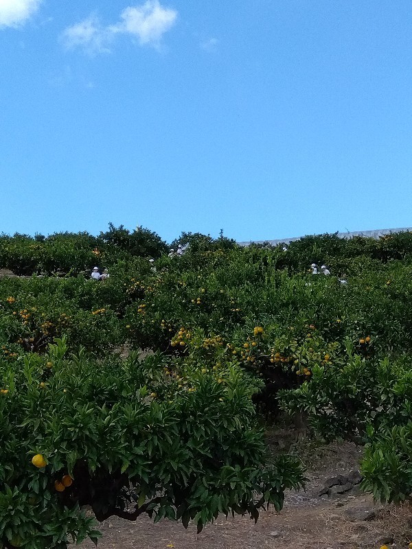 上ノ太子駅から40分歩きみかん園に到着しました。係の方からみかんの育て方や食べ方などのお話を聞いています。こちらのみかんは温州みかんで種がなく甘い品種とのことです。
