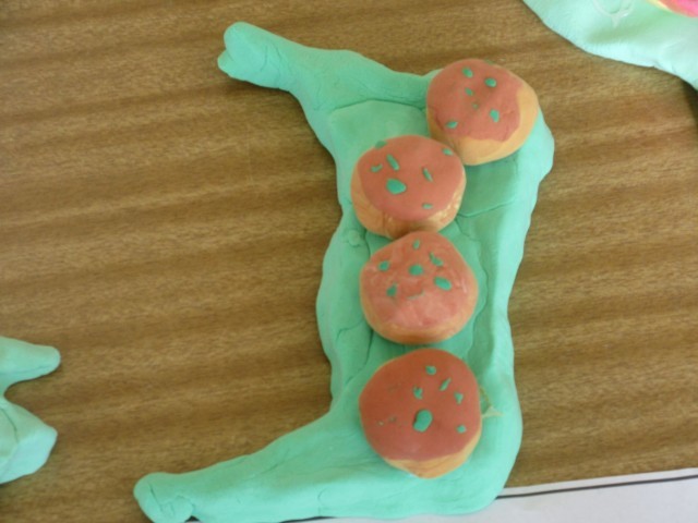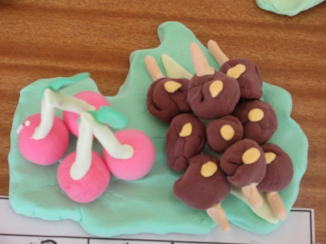 4年生の作品は、手の重なりをデザインした絵と都道府県の形にしたお皿に、特産品を乗せた紙粘土の作品です。1つ目ののお皿は「山形県:さくらんぼと玉こんにゃく」。2つ目のお皿は「大阪府:たこやき」です。