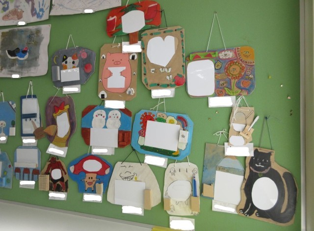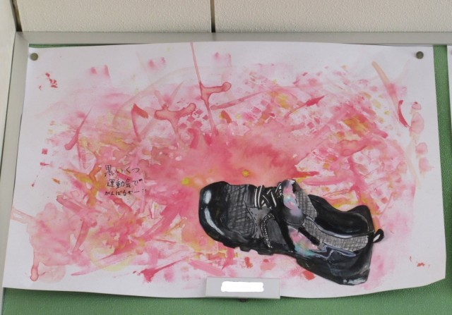 5年生の作品は、ホワイトボードのメッセージ板と自分の靴の絵です。