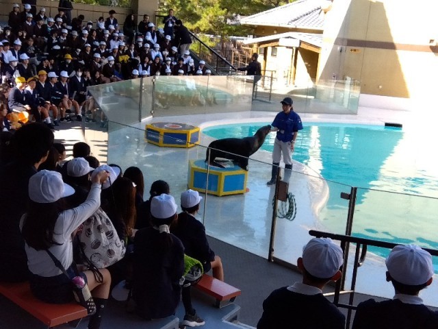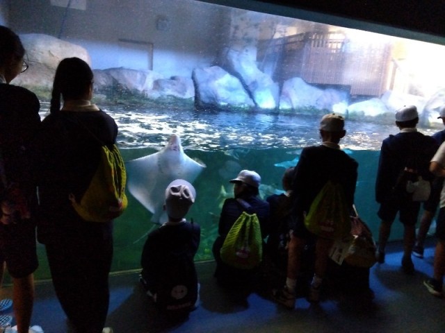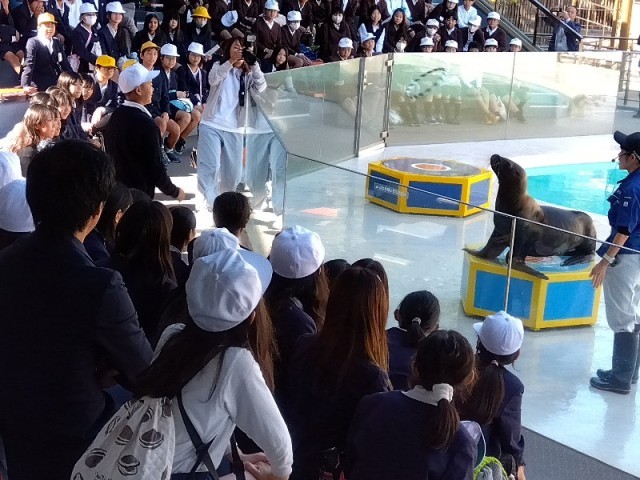 6年 みんなでアシカショーを見ています。代表に選ばれて輪っか投げにチャレンジ!