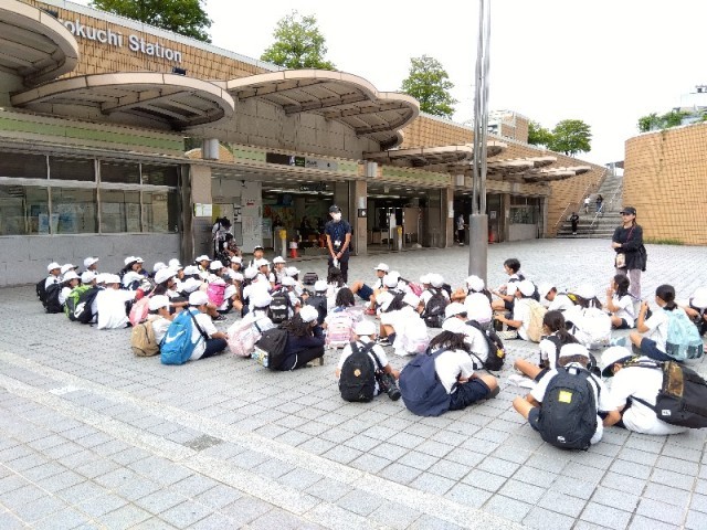 河内松原駅に着きました。電車での約束を確認しています。万博へはバスで行ったので、入学して初めての電車での遠足。