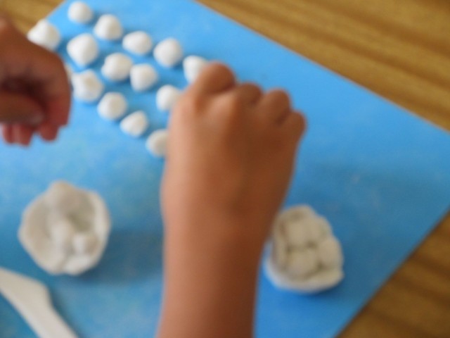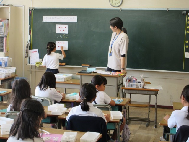 教室を覗くと、粘土でたくさんの丸いものを作っています。「図工かな?」と思ったら、算数の勉強でした。「1皿に5こずつお菓子を乗せると、全部でお菓子はいくつでしょう。」というかけ算の勉強をしていました。お皿もじょうずに作って、お菓子を5個ずつ乗せています。