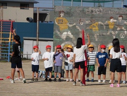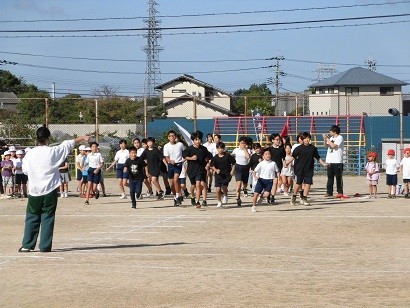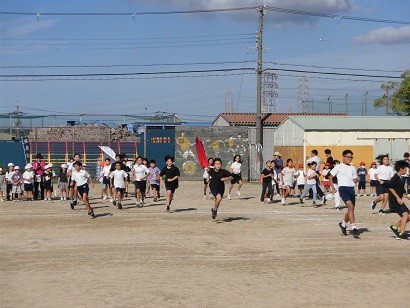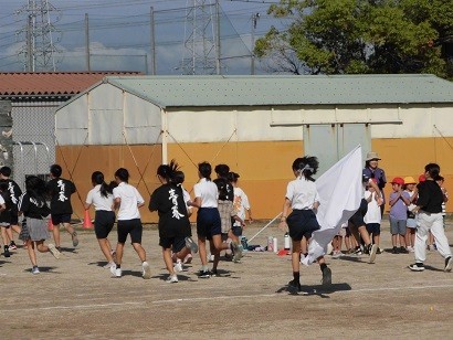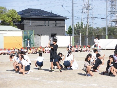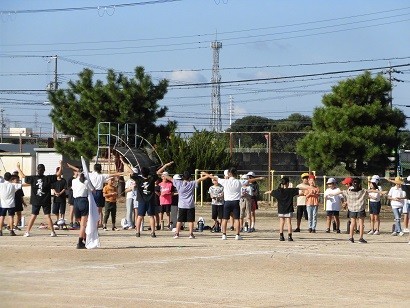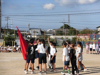 全体練習で応援合戦の練習を行いました。6年生は夏休み前から準備をしていました。9月になって本格的に練習をはじめいよいよ本番が近づいています。運動場には応援のエールが大きく響きました。