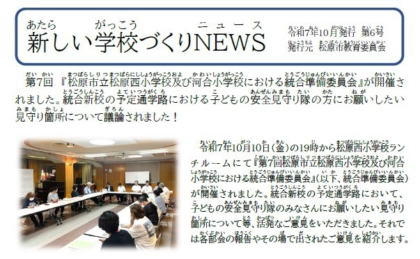 新しい学校づくりNEWS 第6号 公開日 2025/10/17 更新日 2025/10/17 お知らせ 教育委員会より、「新しい学校づくりNEWS 第6号」が発行された旨、連絡がありました。松原市教育委員会ホームページ、もしくは本校ホームページのリンクからもご覧いただくことができます。よろしくお願いいたします。新しい学校づくりNEWS 第6号