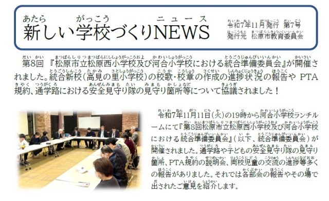 新しい学校づくりNEWS 第7号 公開日 2025/11/18 更新日 2025/11/18 お知らせ 教育委員会より、「新しい学校づくりNEWS 第7号」が発行された旨、連絡がありました。松原市教育委員会ホームページ、もしくは本校ホームページのリンクからもご覧いただくことができます。よろしくお願いいたします。新しい学校づくりNEWS 第7号