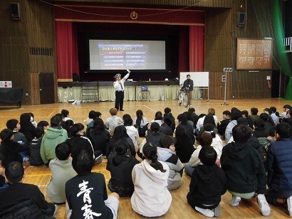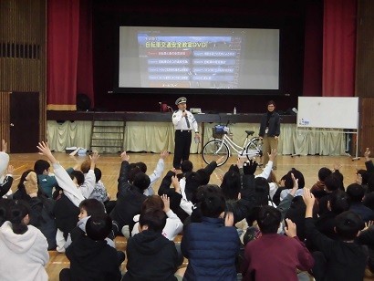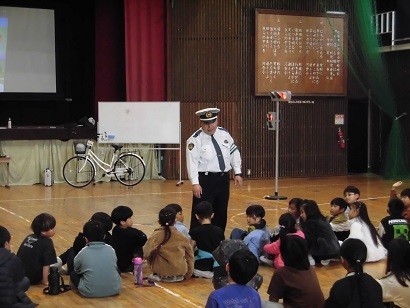 松原警察署より講師を招いて交通安全教室を行いました。低学年は信号のルールや交通ルールについて学びました。高学年は自転車のルールや安全運転について学びました。自転車に乗るときはヘルメットが大切なことも教えていただきました。