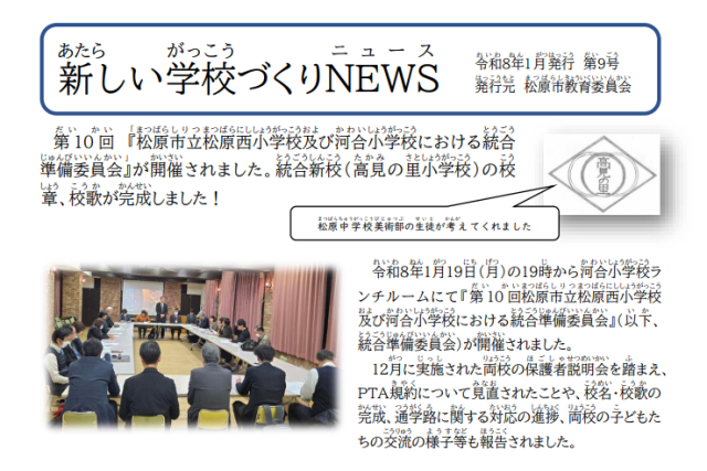 新しい学校づくりNEWS 第9号 公開日 2026/01/23 更新日 2026/01/23 お知らせ 教育委員会より、「新しい学校づくりNEWS 第9号」が発行された旨、連絡がありました。松原市教育委員会ホームページ、もしくは本校ホームページのリンクからもご覧いただくことができます。よろしくお願いいたします。新しい学校づくりNEWS 第9号