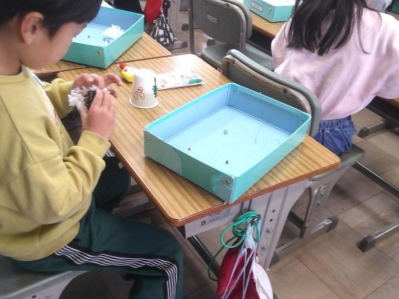 1年生は松ぼっくりを使って、ツリーづくりをしていました。