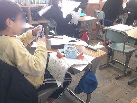 側面になる長方形の長さを考えたり、底面の円周を考えたりしながら、展開図を完成させていました。