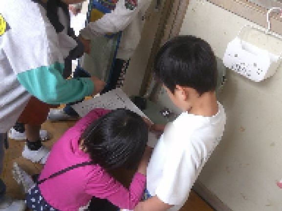 2年生は、1年生に「こっちやで」「スタンプ、押す?」と優しく声をかけてくれたり、時には一緒に迷っていたり(笑)、楽しそうに活動していました。