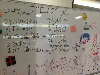 今日は、学年合同で2学期末のお楽しみ会をしました。たんぽぽ学級のみなさんもご招待しました。中国ゴマ、劇、けん玉、ウクレレ、ダンス、ものまね、マジック、ビンゴ大会、こわい話、サプライズ企画、・・・。バラエティーに富んだ、盛りだくさんの内容でした。実行委員さんが中心となり、みんなで協力しながら楽しい会をつくることができました。2学期、さらにパワーアップした、頼もしい4年生の姿を見ることができました。