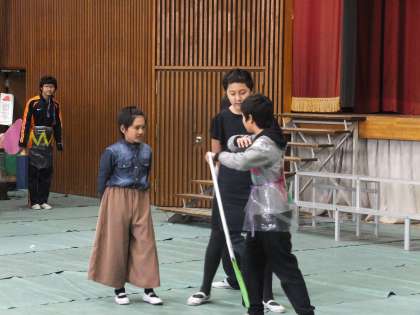 授業参観で桃太郎の英語劇をしました。クラスで工夫した内容で、本当の桃太郎から話の内容が大きく変わっていました。笑いあり、ダンスありで、お父さん、お母さんからに喜んでいただけたと思います。3週間の準備期間で、よく頑張ってくれました。