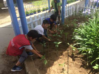 今年も児童会本部の子どもたちが「はるかのひまわり」の苗を植えました。去年から、七中校区の幼稚園、小学校、中学校が同じ取り組みを行っています。「はるかのひまわり」を通して、災害の恐ろしさ、命の尊さを考え、家族や友達を思いやる心、そして地域の一員として地域の人たちとつながることの大切さを考える機会になってくれたらなと考えています。