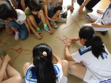 7.1小学校からは、組紐の作り方を教えてもらい、恵我南小学校からは、折り紙やコマ、けん玉の遊び方を教えました。子どもたちは、言葉は通じないけれど、身ぶりや手ぶりを交えてしっかりと教え合っていました。