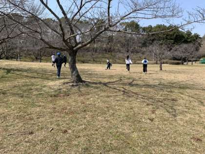 スケールの大きな「かくれんぼ」開始です。ビブスをつけて逃げる人に続いて、オニさんたちは、作戦会議のあと、出発しました。