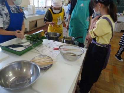 ほうれん草とじゃがいもをゆでる活動です。ゆでるとかさが減って食べやすくなることや、じゃがいもの方が火が通るのに時間がかかることにも気づきました。