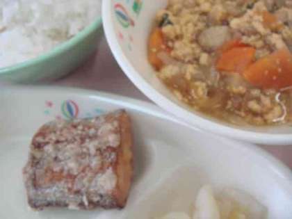 さて、本日(10日)の給食は親子丼、たちうおのたつた揚げ、塩ぽんず和え、牛乳でした。親子丼がほんのり甘くて最高においしかったです!