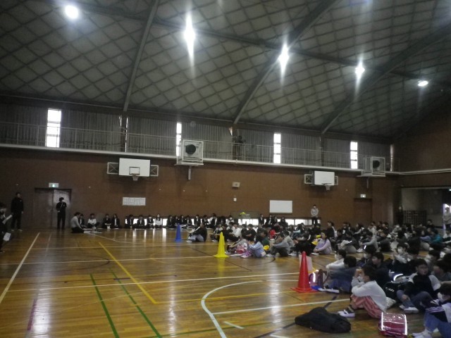 本日、午後、3つの小学校の6年生が中学校に集合し交流会を行いました。