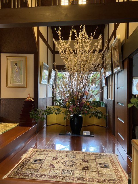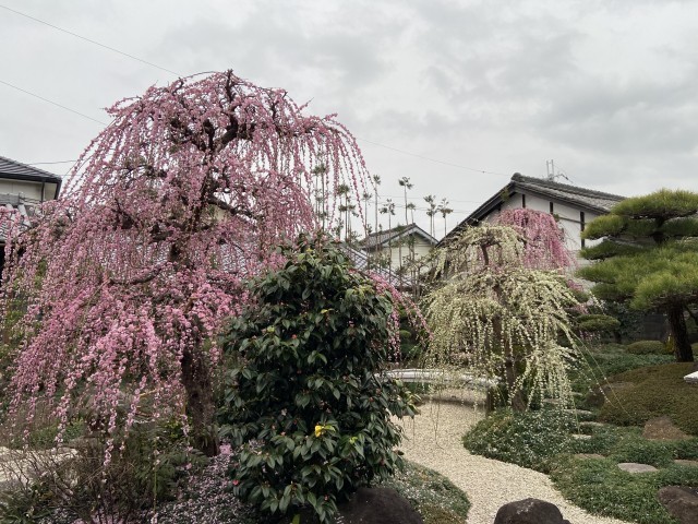 本日、松原中学校区にある個人のお宅を訪問しました。お庭にはきれいに梅が咲き誇っていました。自宅の中も案内していただき、雛人形や季節の品品を見せていただきました。それらの歴史についても説明を受けました。