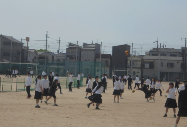 たくさんの子たちがグラウンドで遊んでいます。先生たちも一緒に遊んだり、見守ったりしくれています。