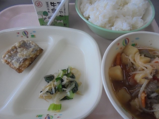 さて、今日の給食は、牛乳、ご飯、太刀魚のから揚げ、もやしの和え物、肉じゃがでした。肉じゃが美味しかった。ごちそうさまでした!