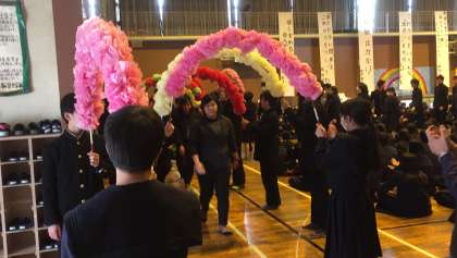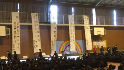 本日1.2時間目に生徒会主催の送別会が行われました。吹奏楽部の演奏から始まり、クラブからのメッセージビデオ、1,2年生からの歌の披露、そして3年生からの歌の披露、最後に3年生各クラスの担任の先生からみんなに向けての言葉を図書委員会が垂れ幕にして3年生の届けました。とても和やかな素敵な送別会でした。3年生あと少し頑張れ!!
