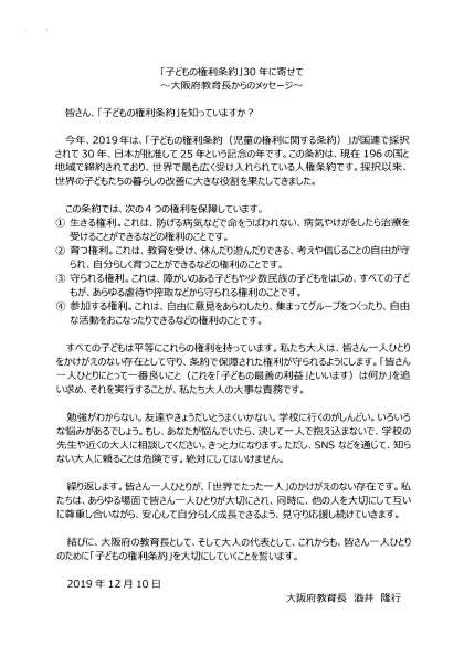 「子どもの権利条約」30年に寄せて、大阪府教育長からのメッセージを掲載しています。ご確認ください。