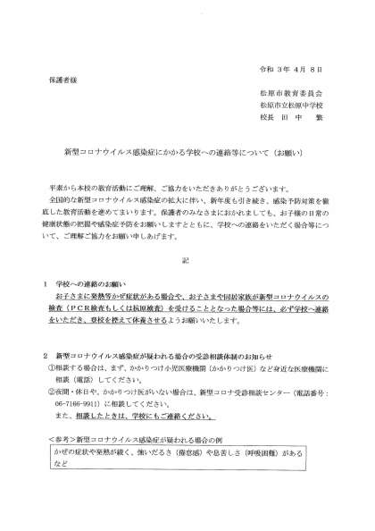 全国的な新型コロナウイルス感染症の拡大に伴い、新年度も引き続き、感染予防対策を徹底した教育活動を進めてまいります。保護者のみなさまにおかれましても、お子様の日常の健康状態の把握や感染症予防をお願いしますとともに、学校への連絡をいただく場合等について、ご理解ご協力をお願い申しあげます。