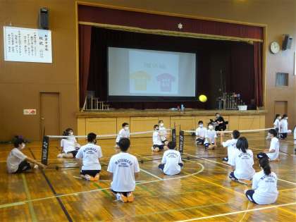 グループで協力しながら、学年レクレーション。シッティングバレーボールでは、一般のバレーボールよりもネットの高さを低くし、コート内の床に座った状態を保ち、全員がオールラウンドプレイヤー!