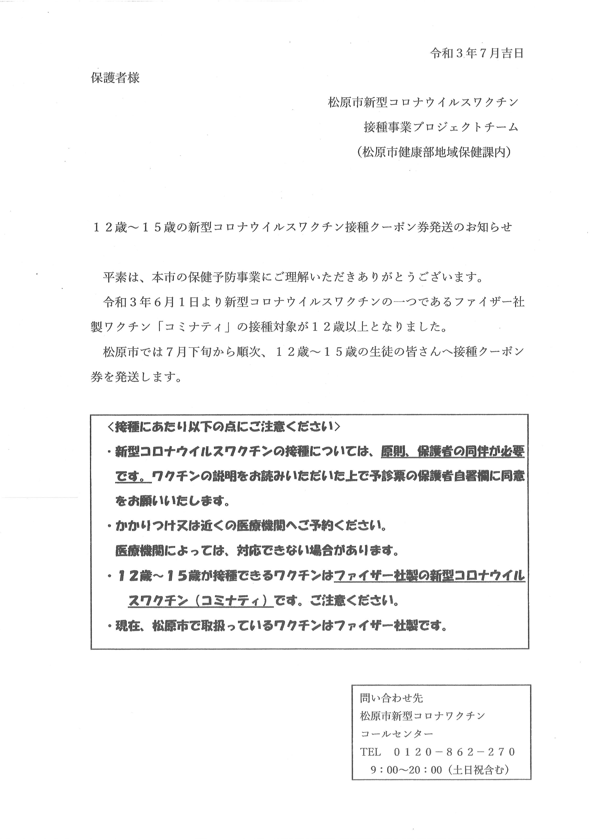新型コロナウイルスワクチン接種(12〜15歳)クーポン券発送について