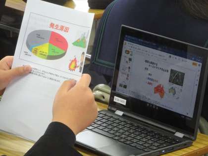 GIGAスクール学習タブレットを活用して「今、地球で起きている課題について探求する」をテーマに、それぞれが設定した題材について多面的に捉え、解決の糸口を提案することをゴールとする研究「課題研究発表会」が続いています。学ぶことの楽しさを実感!