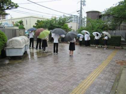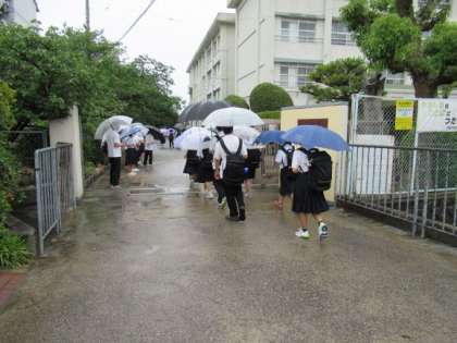 傘の華が並ぶあいさつ運動、雨の中ですが元気なおはようございますの声が聞こえてきます。