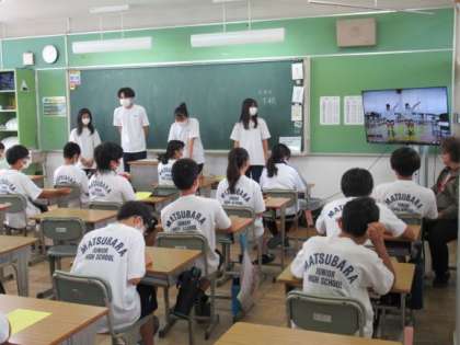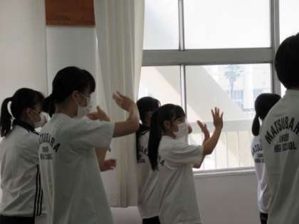 綱引きの予選が延期になり、急遽変更した応援練習風景です。タブレットで撮った映像を効果的に使って、先輩から後輩に教える姿がすてきでした。声出しができないため手拍子や振り付けを覚えることになりました。みんな飲み込みの早いので対応でした。でも全体で応援練習ができるほどでした。
