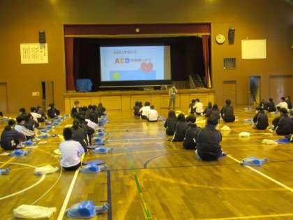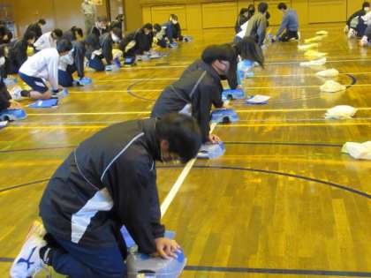 松原消防本部の方に来ていただき救急救命講習を実施しました。体育館では2クラスずつに分かれ心肺蘇生法(胸骨圧迫)とAEDの使い方について学び実際に訓練を行いました。救急車が来るまでに心肺蘇生を行っていれば助かる命はあるということで真剣な表情で訓練しました。1分間で120回のテンポで絶え間なく胸骨圧迫を続けることは結構大変なことですが、頑張って体験をしました。