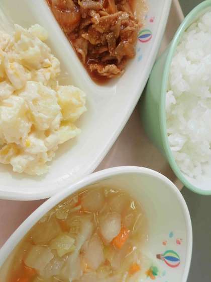 さて、本日(9日)の給食はポークチャップ、冬瓜のスープ煮、ポテトサラダ、ごはん、牛乳でした!ポークチャップでごはんが進むし、ポテトサラダはコーンがたっぷりでどれもおいしかったです!