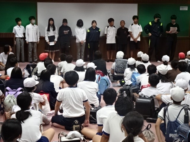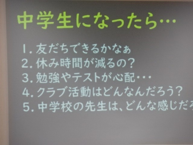 最初に生徒会から中学校の生活について紹介し、その後は8つの教室に分かれて授業を体験してもらいました。最後には部活動の紹介をそれぞれのキャプテンからしてもらいました。