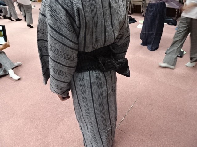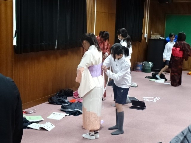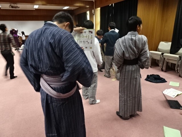 浴衣を羽織り、帯を締めるまでをペアになっておこなうのですが、帯を結ぶのにどの生徒も悪戦苦闘。コツさえつかめばきれいにできるのですが、初めてだとそうもいかず、「先生、わかりません」の声があちこちから上がっていました
