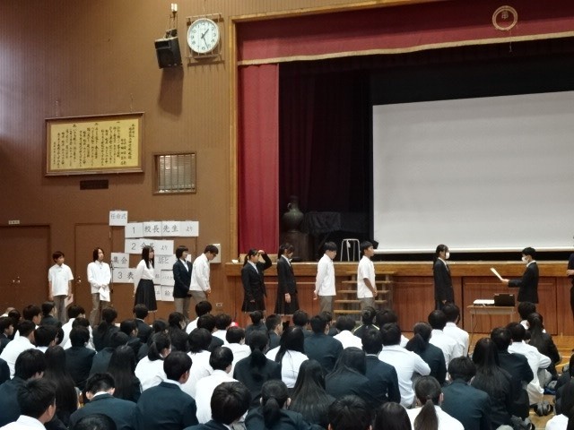 今日の全校集会は、「生徒会任命式」「表彰」「いきいきふれあい祭りボランティア募集」「11月から使用可能になる防寒着について」のテーマで行いました。