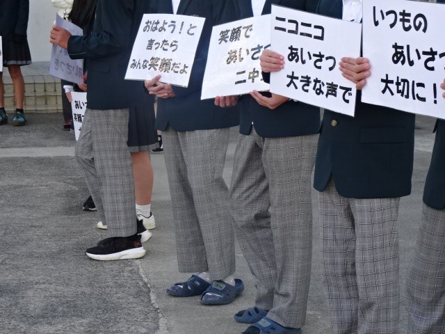 きのうは学級委員、今日は生活委員が始業前に門に立ち、プラカードを掲げてあいさつをしていました。