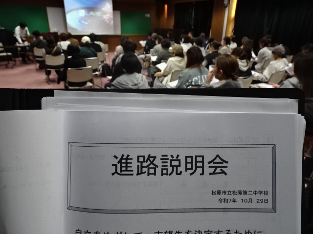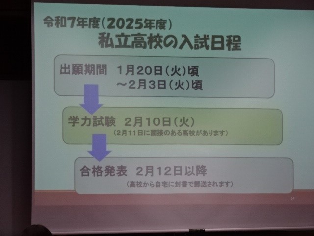 私立公立の入試制度や日程、判定方法やオンライン出願についての説明等をさせていただきました。再来週からは進路懇談がはじまるなど、3年生は卒業に向けての準備が本格化していきます。