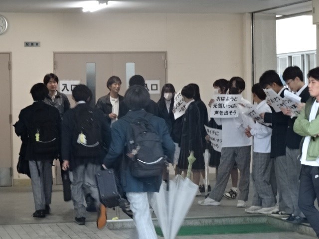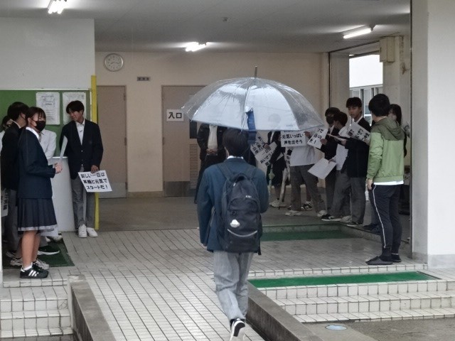 あいさつ運動4日目、きょうはあいにくの雨です。下足室あたりにみんなで立ってもらいました。きょうは1年生の学年閉鎖が明け、久しぶりに3学年がそろっての登校風景となりました。