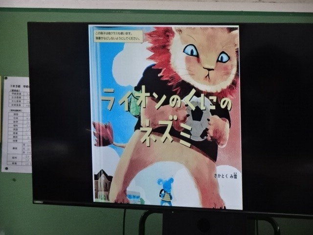 1年生の多文化共生教育のひとつ、「ライオンのくにのネズミ」を読んでの学習の様子です。
