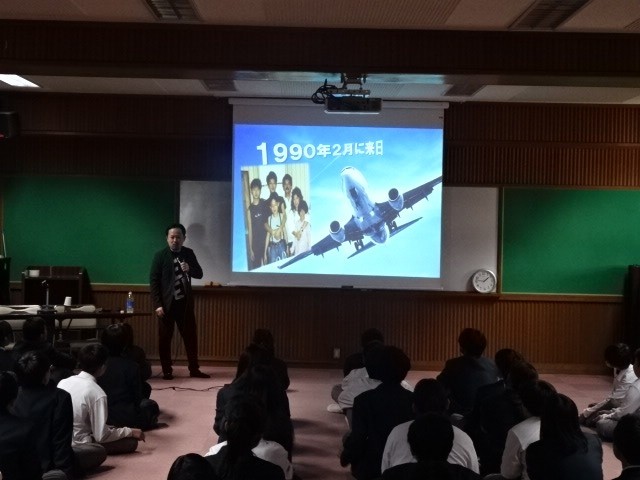 12月2日(火)5・6限目の総合の授業。1年生の人権学習。講師に多文化共生NPO世界人の具志アンデルソン飛雄馬さんに来ていただきました。