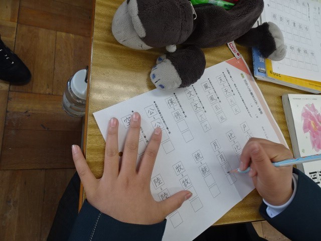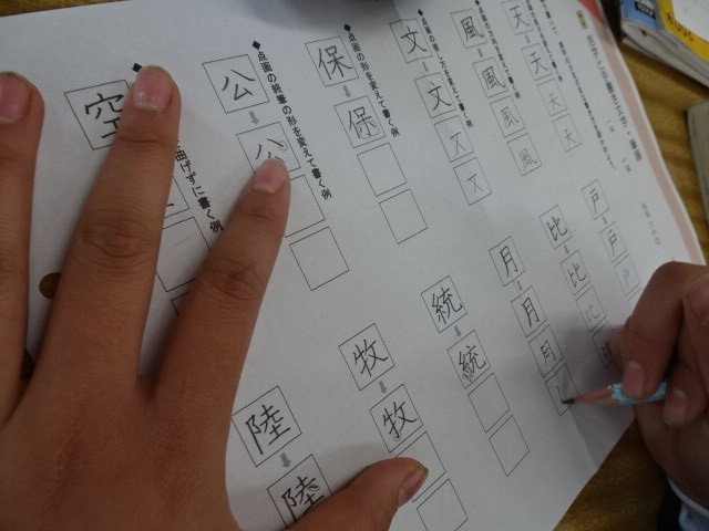 1年生の書写の授業をのぞいてみました。漢字の書き順(筆順)について、ルールを説明してもらい、実際に間違えやすい漢字の書き順を、確認しながら書く練習をしました。