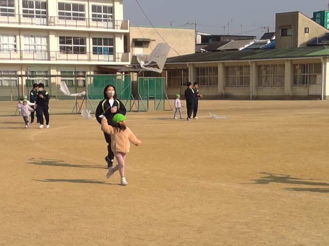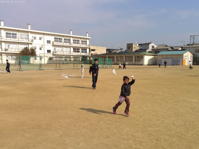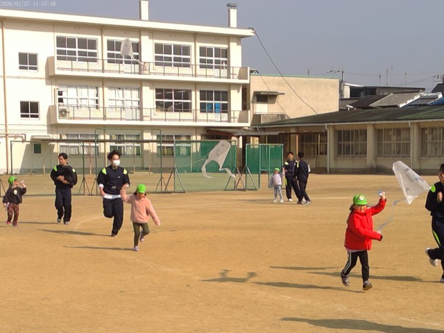 みつばち保育園の園児さんたちを招いて、グラウンドいっぱい使っての凧あげ遊びをしました。うまくあがってみんなニコニコです。