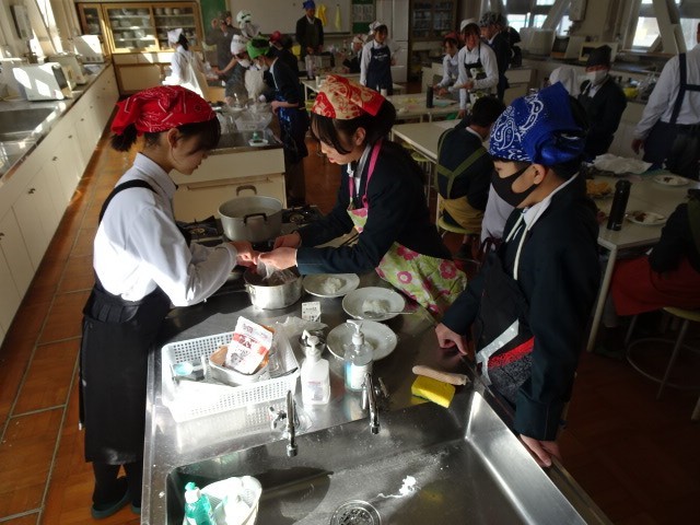 2年生の調理実習では、班ごとに工夫して困難を乗り切るシミュレーションが行われました。鍋1杯分の水、熱源はカセットコンロと固形燃料。水を節約するため、お皿にはラップを引いて汚れないようにします。お米は耐熱ビニル袋に入れて熱湯で茹でるか、メスティンでの炊飯にチャレンジ。ホットケーキミックスでスコーンを作る班もあれば、ホットケーキにしてミートソースをかける班など、それぞれに工夫していました。実習は終始電灯をつけない状態で行われ、みんな真剣に取り組んでいました。