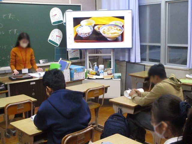 当日は一緒に授業を受けさせてもらいました。1時間目、「日本語」の授業では接客をする側とお客という設定で対話の練習をしました。2時間目、特別活動では生徒会の皆さんが運営する「初心の日」の集会に参加して、一緒に歌を歌いました。その後は一緒にパンを食べながらクラスの学活に参加しました。