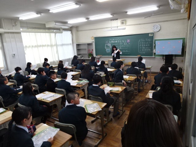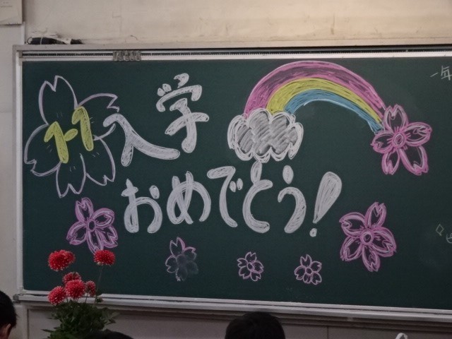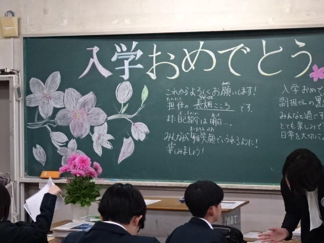 式の後、学級担任から初めてクラスの生徒たちに挨拶をしました。それぞれの先生方が思い思いの黒板アートで生徒たちをお出迎えしました。
