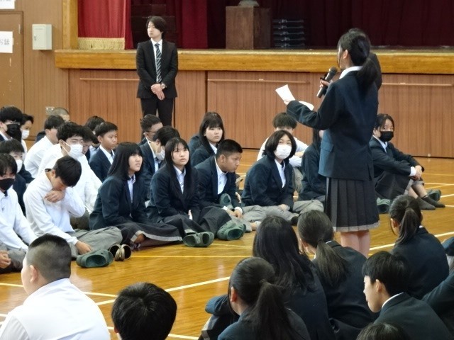 今日は始業前からクラス発表があり、あたらしいクラスでそろっての始業式・対面式を行いました。対面式では一年生の代表から「二中の合言葉を大切にし、頑張っていきたい」と意気込みを述べてもらいました。